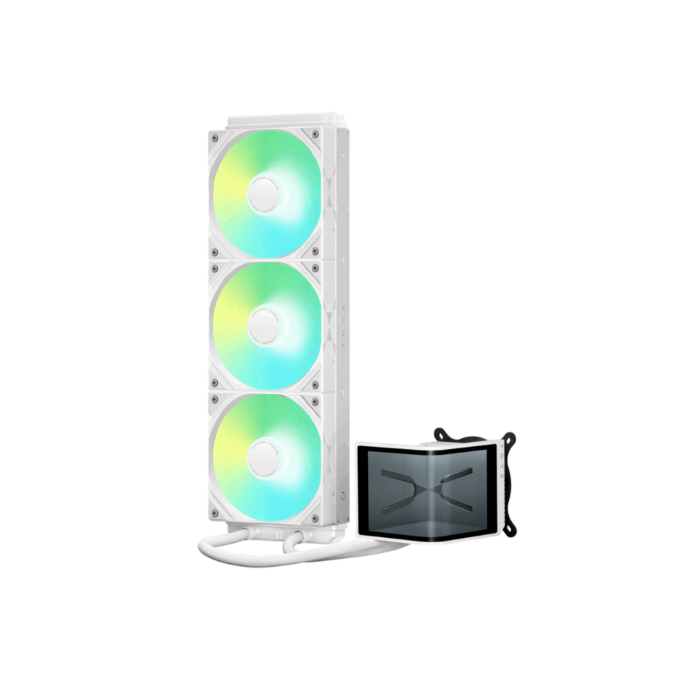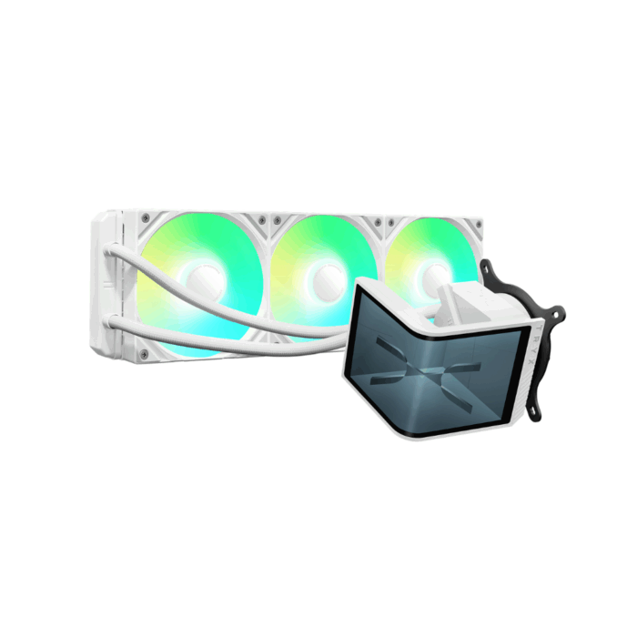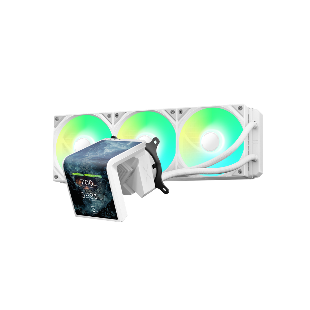The rotatable 6.67” AMOLED curved screen integrated into the TRYX PANORAMA SE enhances your PC cooling experience with stunning 3D anamorphic effects that bring your build to life. This customizable AIO cooler boasts a 360mm liquid cooling radiator in white with vibrant ARGB lighting, powered by an efficient Asetek Adela pump supporting up to 280W TDP, perfect for Intel LGA 1851/1700/1200/115X and AMD AM5/AM4 platforms.